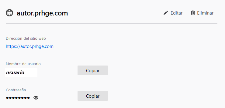 Es probable que el navegador los recuerde. Si ha guardado el nombre de usuario o la contraseña en el navegador, podrá recuperarlos. En caso contrario, visite la página de inicio: https://autor.prhge.com y haga clic en ¿Olvidó la contraseña? para obtener una nueva contraseña junto con un recordatorio de su nombre de usuario.